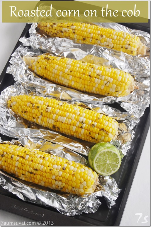 Friends I didn’t post recipes frequently for the last few weeks as my DSLR camera had some problem. Finally I got it back after service. It is a big relief now. I thought of sharing this simple recipe as a summer special. Corn ears are roasted in oven with cilantro lime butter. Best for outdoor parties during summer and kids will love this.